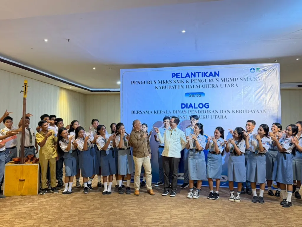 Kepala Dinas Pendidikan dan Kebudayaan Provinsi Maluku Utara, Dr. Abubakar Abdullah, berfoto bersama para siswa SMA dalam kunjungan kerja di Halmahera Utara (14/4/2026). Source : Istimewa